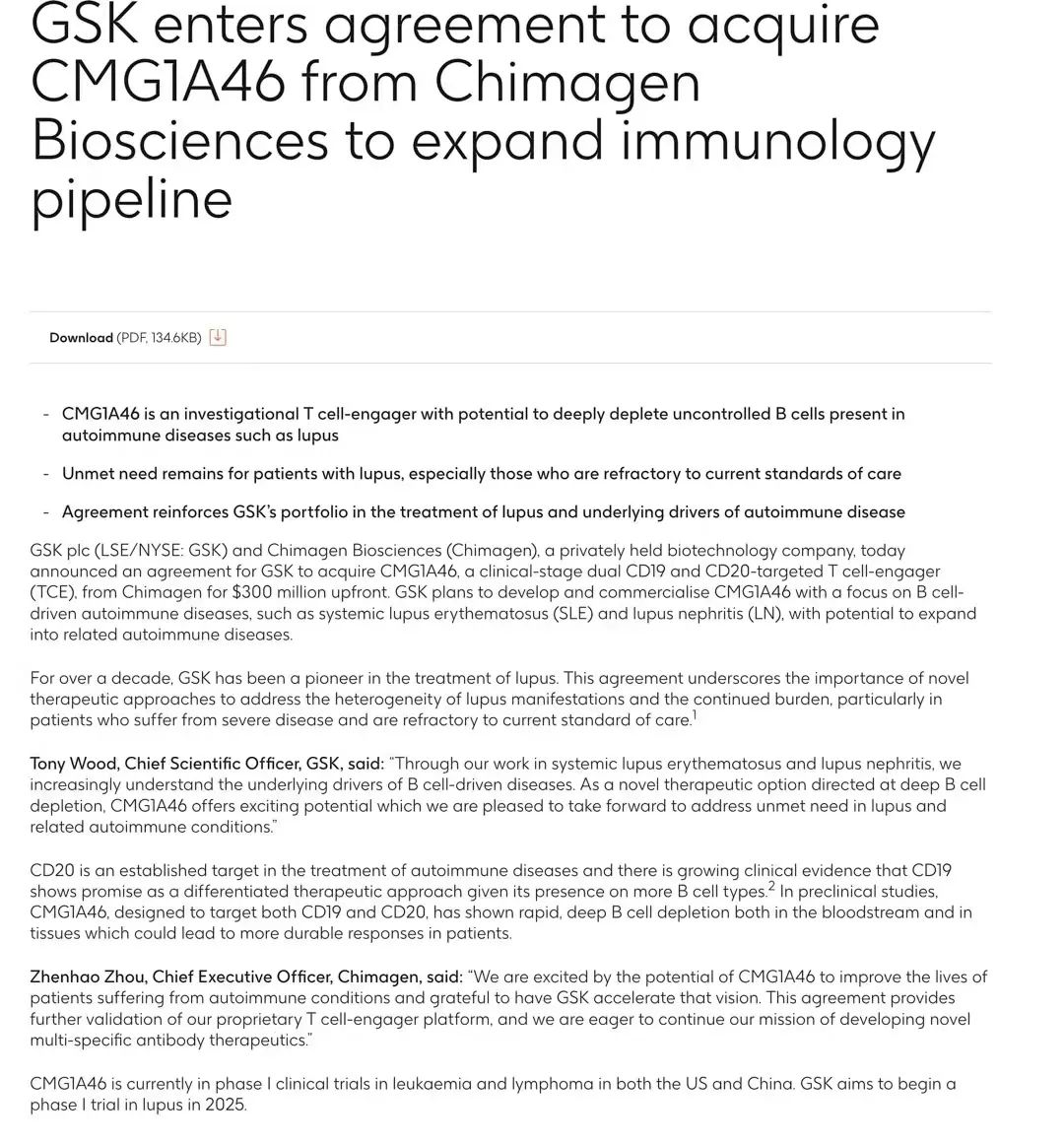 2024年10月29日,葛兰素史克宣布以3亿美元预付款+5.5亿美元里程碑金额引进恩沐生物的CMG1A46,该分子目前处于血液瘤一期临床,自免适应症预计2025年进入一期临床。