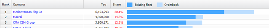 据Alphaliner的百强数据表明,MSC目前拥有船舶868艘,其中自有船舶575艘,新造船订单131艘(新造船订单运力接近200万TEU,相当于目前世界第六大集运公司ONE的总运力),总运力达619万TEU。目前已控制全球超过五分之一的集装箱船市场。
