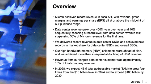 美光预计,到 2025 年下半年,消费领域的需求将更加疲软:尽管我鼓励大家耐心等待消费业务的腾飞,但投资者已经对企业/数据中心业务充满信心。第一季度,美光报告数据中心收入同比增长 400%,数据中心收入也首次超过美光收入的 50% 以上。