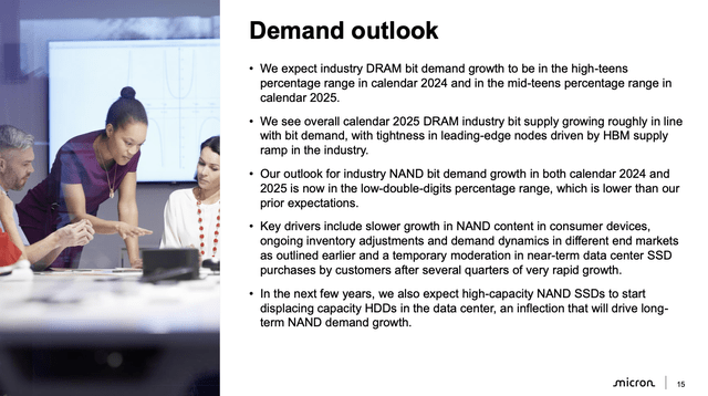造成这一现象的主要原因是消费终端市场需求减弱,尤其是个人电脑和智能手机。这些产品大量使用美光的 NAND 存储芯片,而之前对手机和电脑上新的 AI 功能将推动立即升级周期的预期正在被重新评估。因此,如下图所示,该公司目前预计 2025 年 NAND 比特的增长率将达到两位数,低于之前的预期。