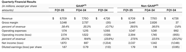 重要的是要认识到 HBM 仍然是美光的早期增长杠杆。该公司指出,它刚刚在第一季度开始向几家大型企业客户大量出货,并正在努力提高这一销售一空的业务部门的制造能力。同样值得注意的是,美光表示 HBM 既能提高 DRAM 部门的毛利率,又能提高公司的整体毛利率。因此,我们应该推断,随着美光的收入结构向高利润率的 HBM 倾斜,远离 NAND(后者的平均售价在第一季度开始以个位数连续下降),该公司在 2025 财年应该会迎来毛利率的顺风。
