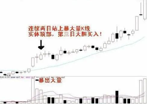 暴大量的买进:连续两天收盘价站上暴大量当日K线实体顶部,第三日买入