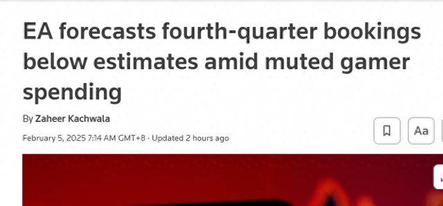 【环球网科技综合报道】2025年2月5日,据路透社消息,近日,视频游戏发行商电子艺界发布预测,称其第四季度的预订量将低于华尔街的预期。这一悲观预测主要源于该公司热门足球特许经营的支出放缓,以及新游戏表现不佳。