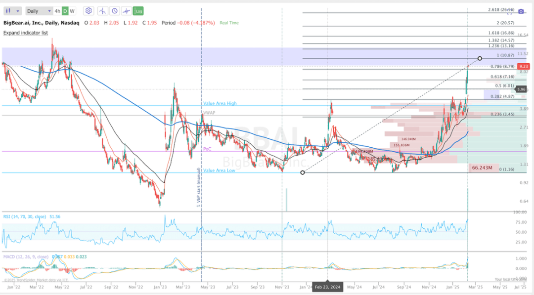 从某种程度上来说,BigBear.ai的交易方式就像杠杆化的 Palantir 代理。该股波动性极大,容易出现大幅上涨,这可能是由空头回补推动的,因为空头持仓占比超过 20%。