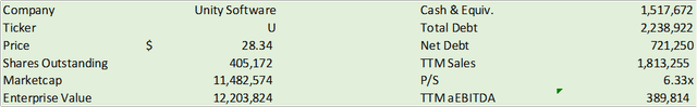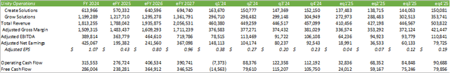 截至 2024 财年,Unity 的现金及现金等价物为 15 亿美元,资产负债表上的债务为 22 亿美元,净债务为 7.21 亿美元。Unity 在 2024 财年显著改善了自由现金流生成,同比增长 60%,达到 2.86 亿美元。管理层打算在未来几年利用过剩现金和现金流来降低资产负债表的杠杆率。