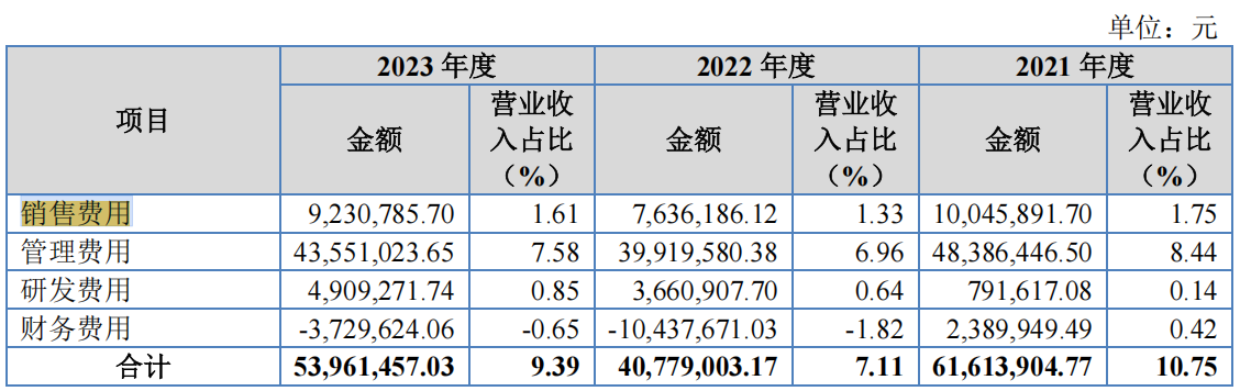 此外,爱舍伦的研发费用远落后于销售费用和管理费用。2023年度的研发费用是491万元,占营业收入的0.85%;而销售费用是923万元,占1.61%,管理费用是4355万元,占7.58%。研发费用明显比销售和管理费用少很多。