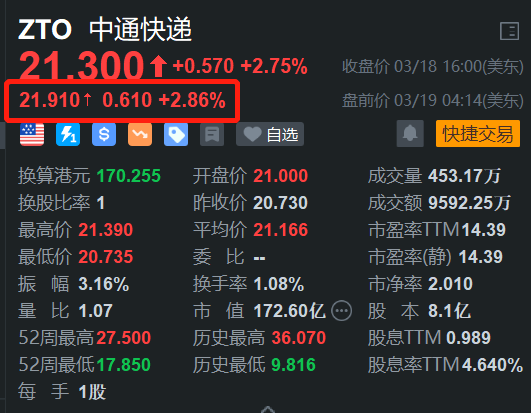 格隆汇3月19日|中通快递港股今日涨超4%,带动中通快递(ZTO.US)美股盘前涨约3%。消息上,中通快递四季度调整后每份ADS收益3.24元,分析师预期3.35元;四季度营收129.2亿元,分析师预期115.2亿元。全年调整后净利润人民币102亿元,增长12.7%,年包裹量增长至340亿件。(格隆汇)