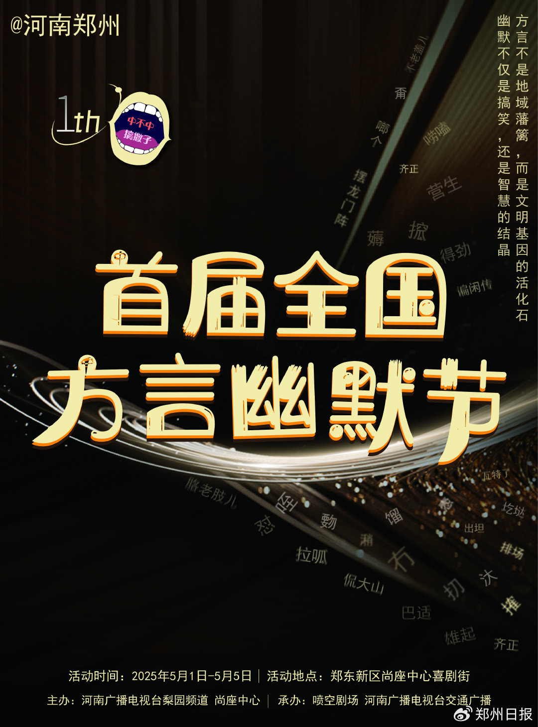 5月1日至5月5日,曾在刘晓庆版《武则天》中饰演王福来的艺术家武利平,中国曲艺家协会副主席、四川谐剧艺术家叮当,曾荣登央视春晚的青年相声演员董建春、李丁,大同数来宝创始人柴京云、柴京海,中国曲艺家协会副主席、淮河琴书艺术家孟影,在《黑神话·悟空》游戏里演唱《黄风起兮》的陕北说书演员熊竹英、青年西河大鼓演员张丽静、上海滑稽戏演员徐秉辉以及河南本土的白军选、秦梦瑶、赵文心、余泽洋、何瑶、王金龙等齐聚首届方言幽默节;中原文化新名片喷空的创始人、全国方言幽默节发起人陈红旭携喷空剧场全体演员和东、西、南、北、中全国各地方言幽默艺术家以及河南十八地市方言达人汇聚郑东新区尚座中心喜剧街,以公益的形式,连续五天从上午11点至晚上10点,为郑州市民上演100场的幽默大餐。