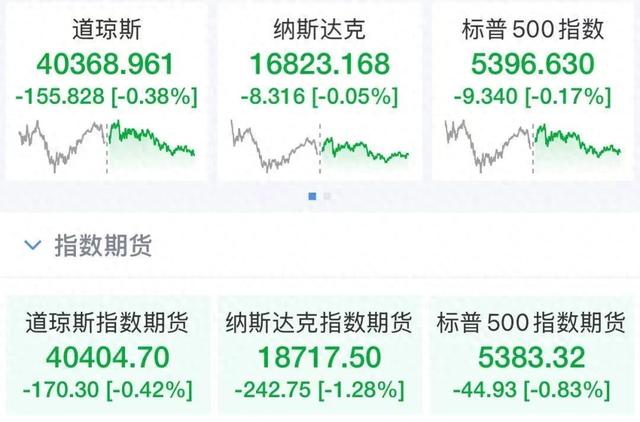 当地时间4月15日,美股三大指数震荡后集体收跌,纳指跌0.05%,标普500指数跌0.17%,道指跌0.38%。盘后,美股三大指数期货也齐齐下跌,纳指期货跌超1%。