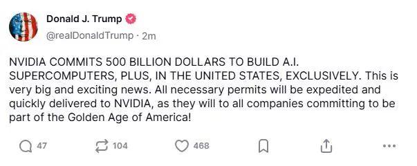当地时间4月15日,针对英伟达承诺斥资5000亿美元在美国独家研发AI超级计算机这一消息,美国总统特朗普在社交平台上发文表示,“这是一个激动人心的重大消息”,特朗普称,将加速办理所有必要的许可并尽快交付给英伟达。