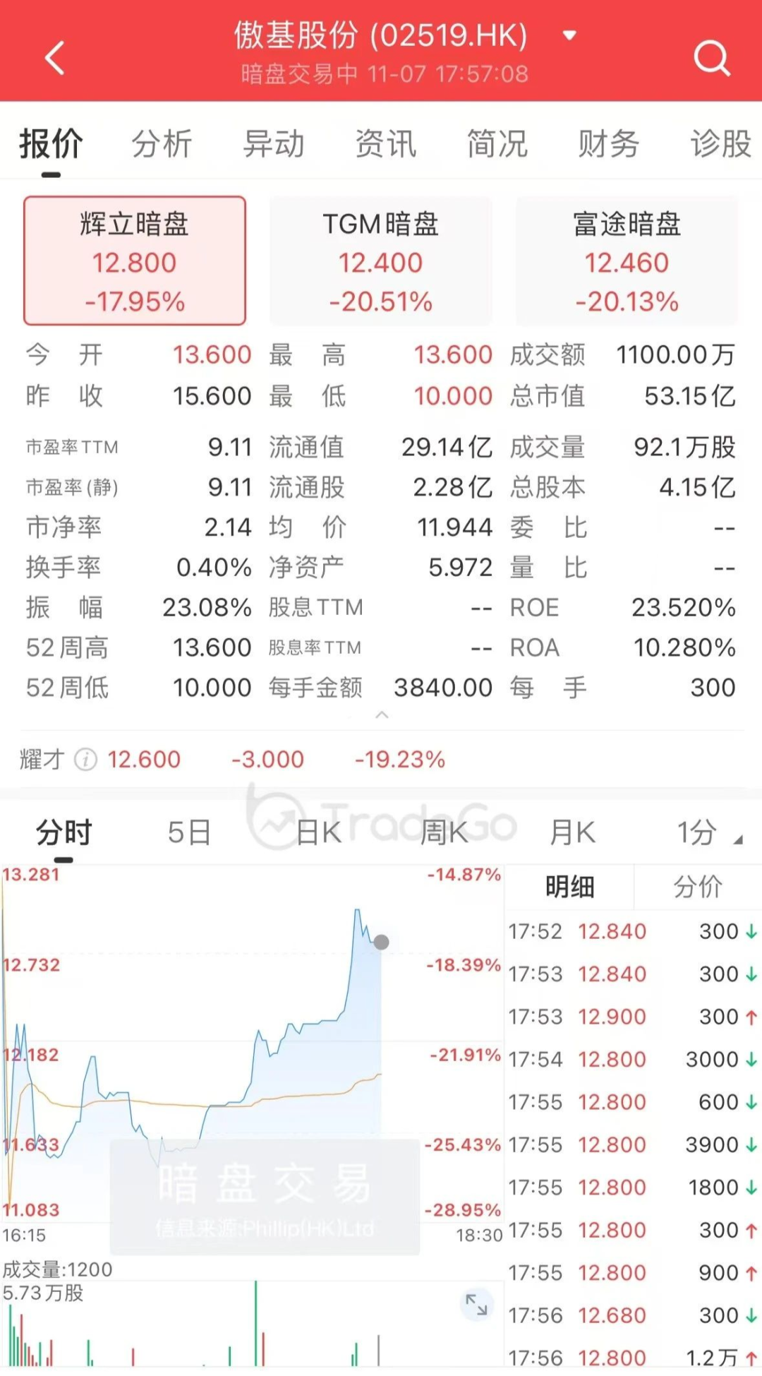 11月7日,傲基股份(2519.HK)暗盤低開,一度跌超30%,後跌幅有所收窄;截至17:57,輝立暗盤跌17.95%,TGM暗盤跌20.51%,富途暗盤跌20.13%。