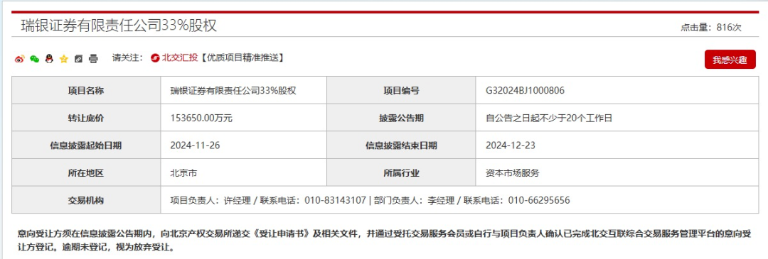 11月26日,北京產權交易所披露信息顯示,北京市國有資產經營有限責任公司(以下簡稱「北京國資」)掛牌所持瑞銀證券有限責任公司(以下簡稱「瑞銀證券」)33%的股權,轉讓底價為15.37億元。