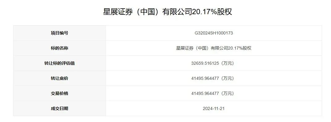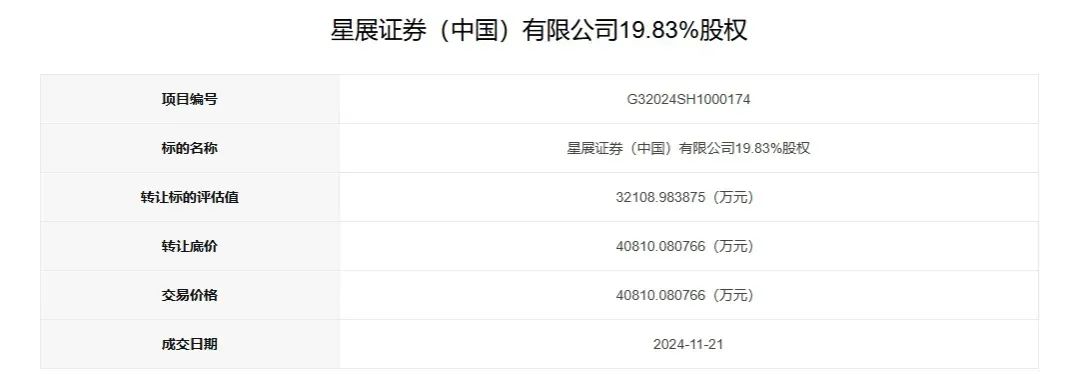 上海聯合產權交易所官網披露顯示,星展證券兩筆股權轉讓項目已於11月21日成交,轉讓比例合計為40%,合計交易價格即轉讓底價8.23億元。