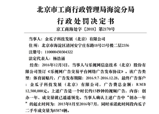 2018年11月,北京工商部門認定瓜子二手車「創辦1年成交量遙遙領先」缺乏事實依據,認定其構成虛假宣傳,開出了1250萬元發單,這也是行業首例千萬級罰單。