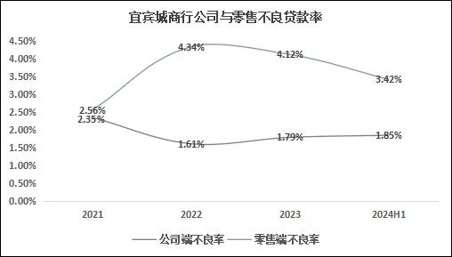但是,從資產質量上看,雖然宜賓城商行零售端不良率從2022年的4.34%降至2024年上半年末的3.42%,但較國內城商行零售平均1.3%不良率仍高出一大截;其中個人商業貸款不良率一度高達7.58%,這也能夠理解其零售端貸款為何持續收縮了。