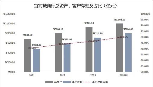 2024年上半年末,宜賓城商行總資產規模錄得1001.93億元,較2021年增加317.03億元或46.29%;同期,客戶存款規模從488.43億元增長至804.63億元,增幅為321.2億元或66.44%,佔總資產比重從70.58%提升至80.31%。