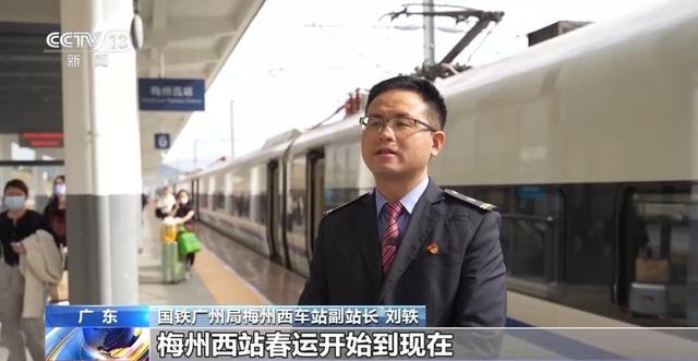國鐵廣州局梅州西車站副站長 劉軼:春運開始到現在發送旅客4.6萬人次,到達旅客7.1萬人次,節前到達旅客日均約1.2萬人次。今日起到27號加開6趟夜間「紅眼」高鐵,同步開啓三條安檢通道。