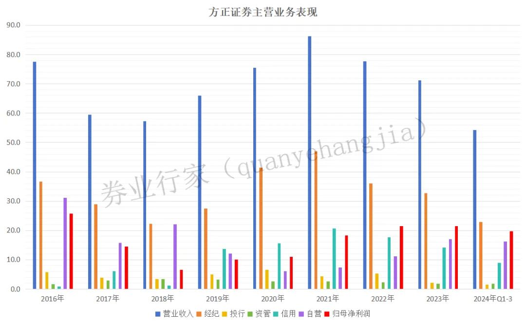 數據顯示,從2016年到2024年前三季度,方正證券的業績有着起伏波動,但財富管理業務的佔比幾乎都在四成以上,最高達到55%。