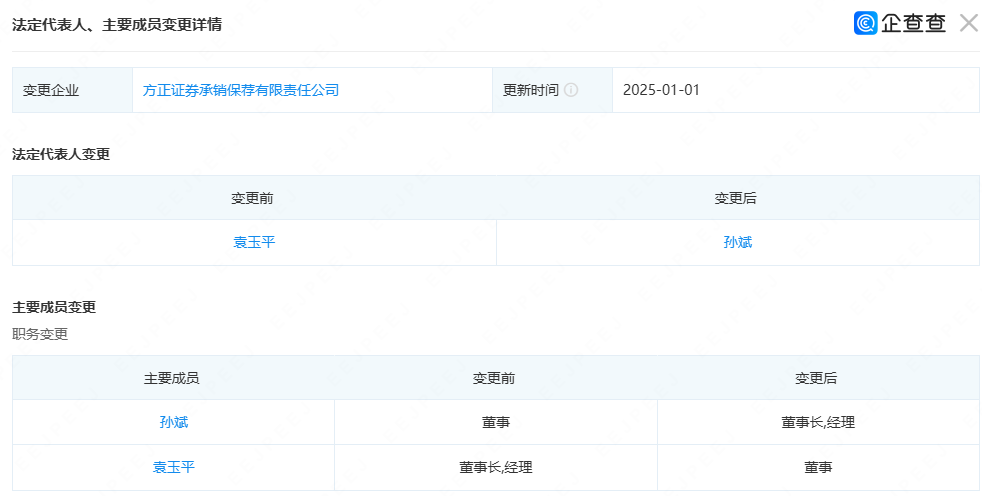 更新於今年1月1日的工商信息顯示,袁玉平卸任方正投行董事長、總經理和法定代表人職務,由孫斌接替。