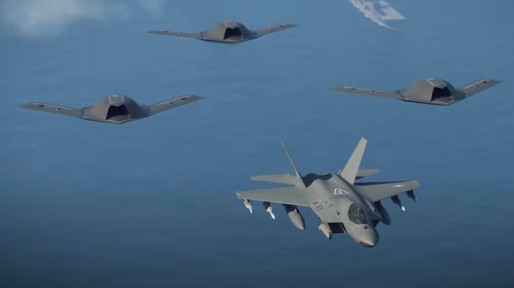 圖:韓國國防採辦計劃管理局(DAPA)發佈的視頻顯示,一架全副武裝的KF-21(配備外部瞄準吊艙)與三架隱形無人機執行任務。圖片來源:DAPA螢幕截圖