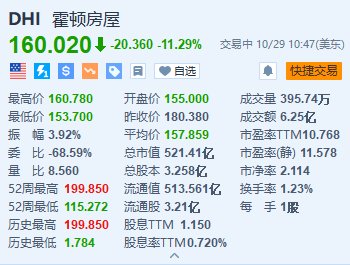 霍顿房屋(DHI.US)跌约11.3%,报160.02美元。消息面上,霍顿房屋公布截至9月的2024财年Q4业绩,综合收入为100亿美元,同比下滑5%,主要原因是该公司的单户租赁业务销售疲软,低于预期的102亿美元;每股收益3.92美元,低于预期的4.17美元和去年同期的4.45美元。该公司预计,截至2025年9月的财年,将交付9万至9.2万套住宅,市场预期为超过9.4万套住宅;全年营收将介于360亿至375亿美元之间,低于预期的394.1亿美元。(格隆汇)