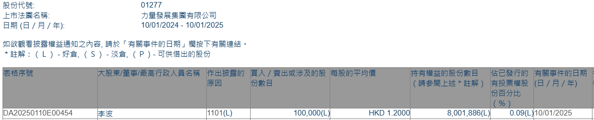 香港联交所最新资料显示,1月10日,行政总裁李波增持力量发展(01277)10万股,平均每股作价为1.2港元,总金额为12万港元。增持后最新持股数目约为800.19万股,持股比例为0.09%。