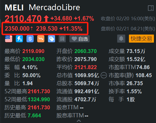 拉美电商平台MercadoLibre(MELI.US)盘前涨11.35%。消息上,财报显示,公司四季度活跃买家、商品交易总额和支付量等所有指标均有所增长,导致总销售额增长了37.4%至60.6亿美元,较市场预期高出1.2亿美元。该公司目前主导着巴西、阿根廷、墨西哥和智利的在线销售业,占南美在线销售的大约一半。它还运营着一个名为Mercado Pago的数字支付平台。(格隆汇)