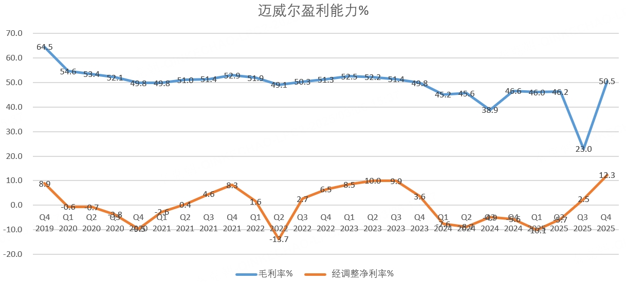 在数据中心营收占比提升之下,迈威尔的盈利能力开始上升,25财年四季度的毛利率达到50.5%,高于管理层给出的50%指引: