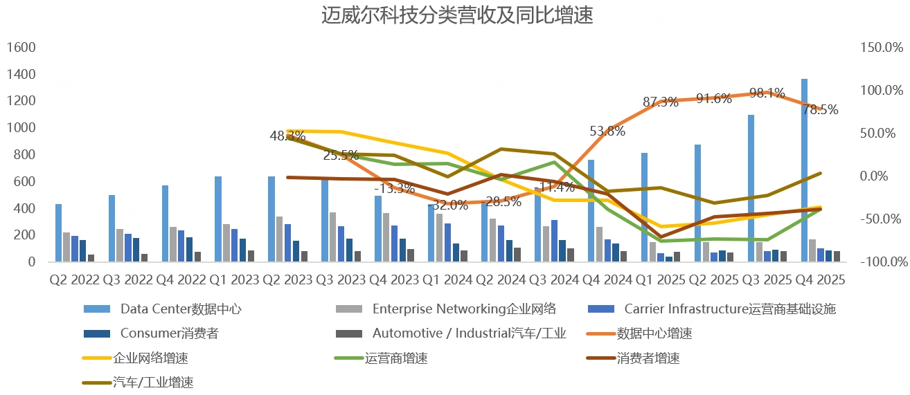 在数据中心业务中,DSP等光电产品贡献了一半,另一半由AI收入组成,定制化ASIC芯片占数据中心收入的比重约25%。