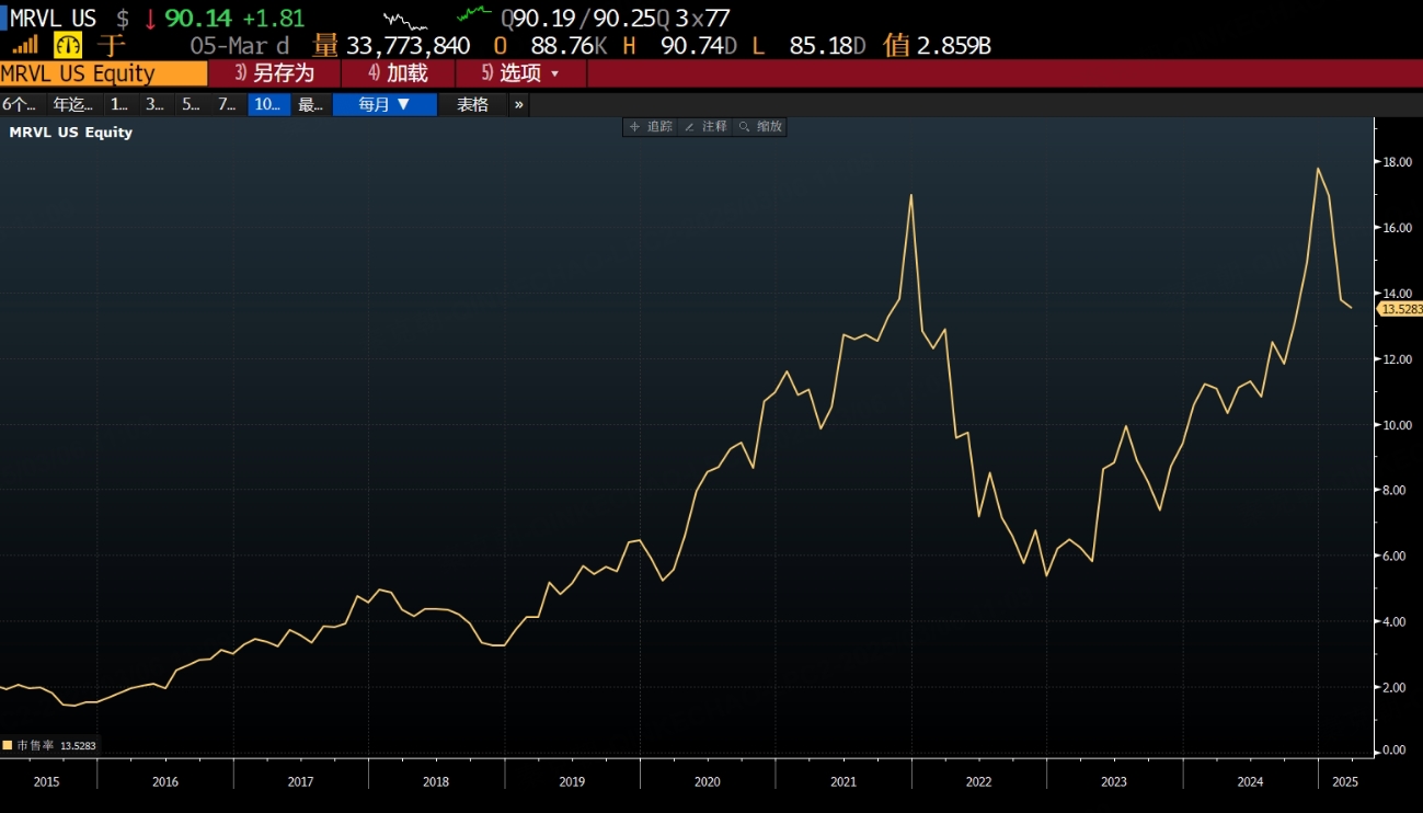 这个估值显然无法和便宜联系起来,而且,目前的定制化芯片市场同样竞争激励,主要是博通这个巨无霸存在,迈威尔压力不小。