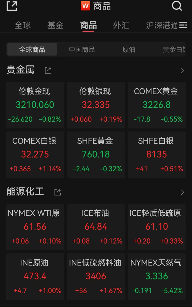 贵金属价方面,伦敦现货黄金价格一度跌穿3200美元/盎司关口,银价走势持稳。其中,伦敦现货黄金报3210.06美元/盎司,跌0.82%,最低触及3193.315美元/盎司,脱离日内所创历史新高3245.73;伦敦现货白银报32.335美元/盎司,涨0.19%。COMEX黄金期货跌0.55%报3226.8美元/盎司,COMEX白银期货涨1.14%报32.275美元/盎司。