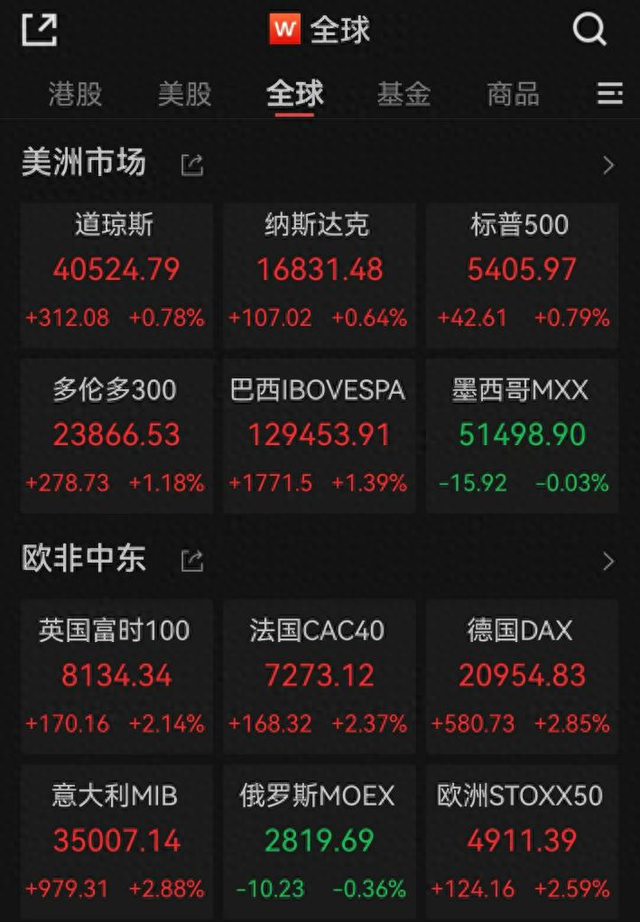 欧洲三大股指全线上涨。截至收盘,德国DAX指数涨2.85%,法国CAC40指数涨2.37%,英国富时100指数涨2.14%。
