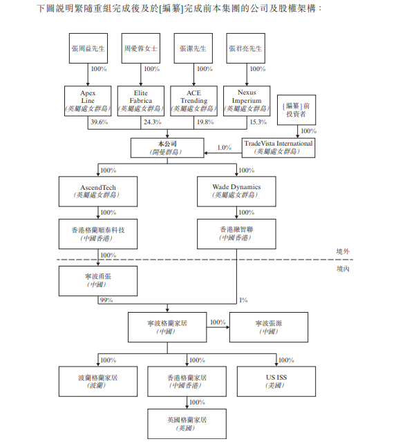 招股书显示,格兰控股在上市前的股东架构中,创办人家族成员张周益、周爱蓉、张洁、张君亮为一致行动人,通过各自BVI公司,合计持股99%。张君亮为周爱蓉女士的配偶,亦为张周益及张洁的父亲。