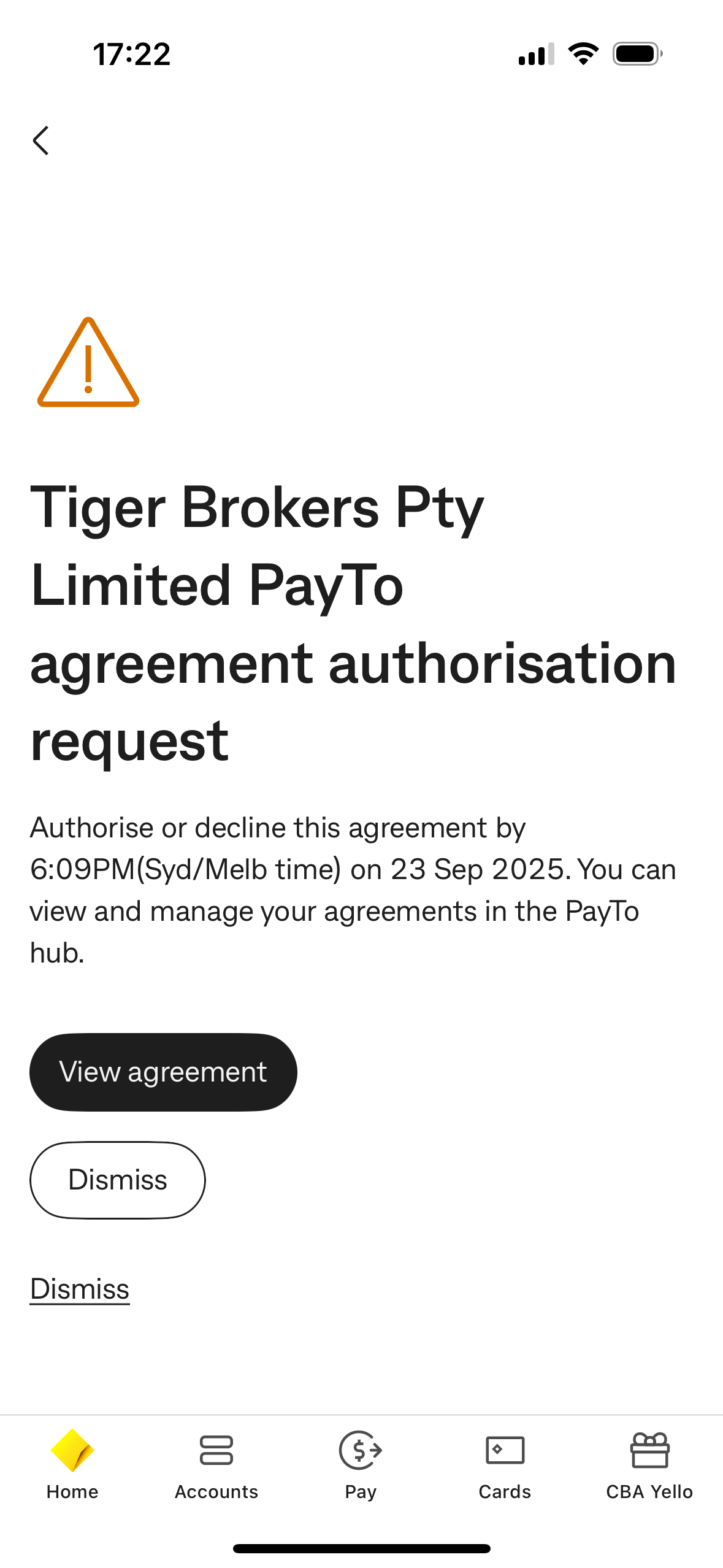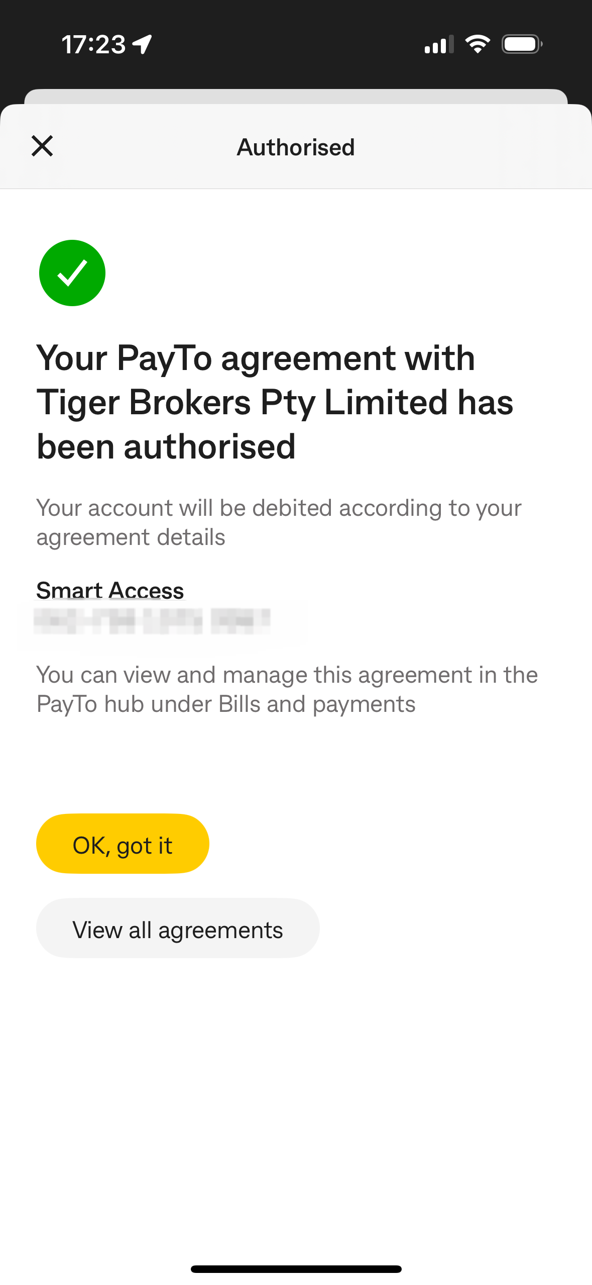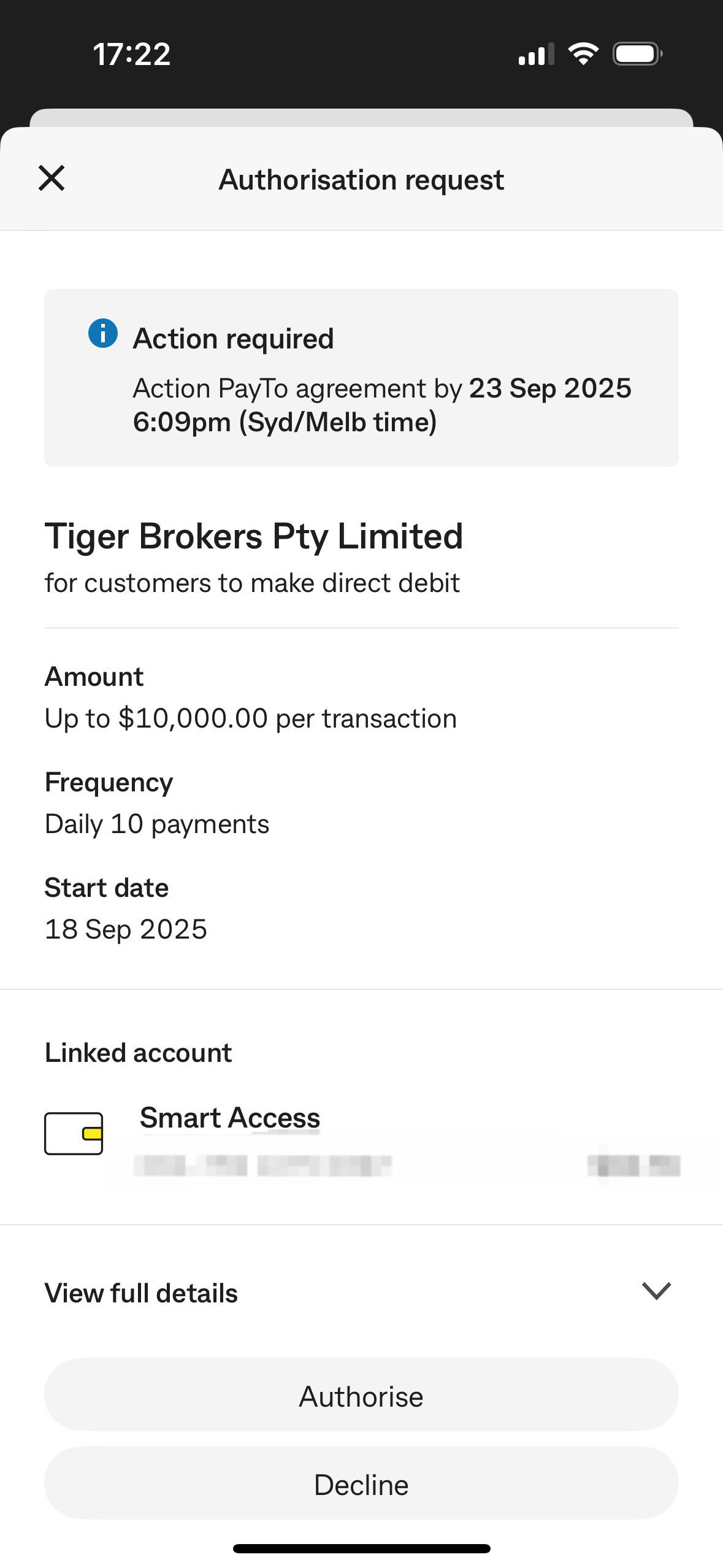 Review and authorise the PayTo agreement with Tiger Brokers within 15 minutes.