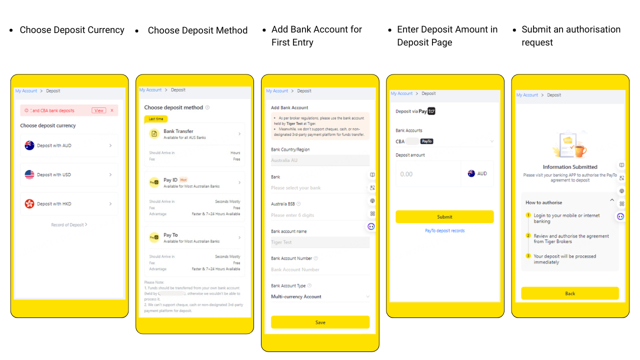 It allows you to deposit funds directly from your bank account to Tiger account, with minimal effort. By providing a one-time consent and authorisation through your banking portal or app to set up a PayTo agreement, your future funding experience becomes seamless: for subsequent PayTo deposit, you will only need to submit the deposit instruction via Tiger Trade app and the deposit will be processed on demand automatically, without you having to log in to your banking app each time or manually initiate the transfer.