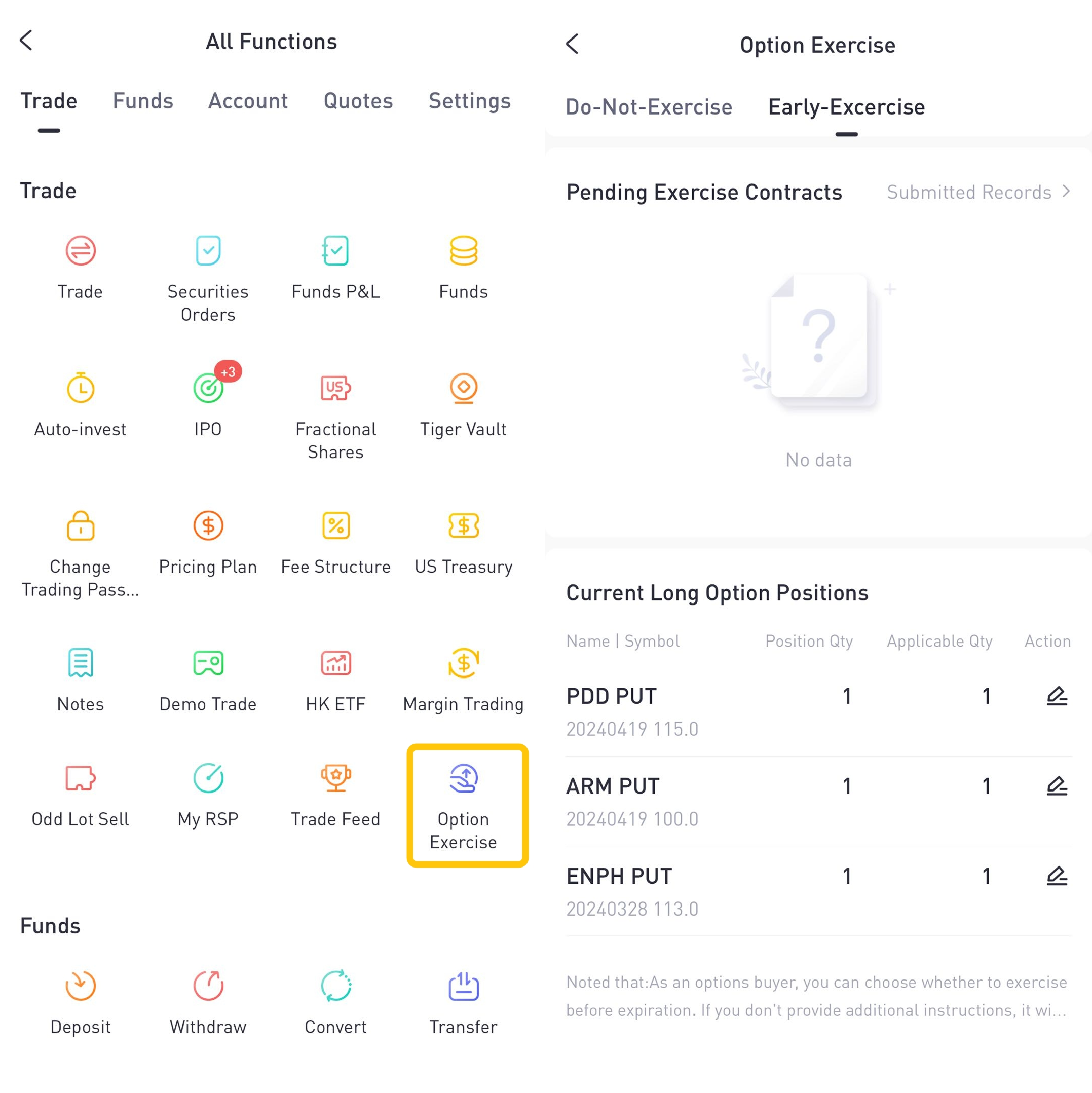 While American-style options allow for early exercise, not all brokers support this feature. Tiger Trade introduced the early exercise feature in version 9.4.4, allowing users to execute early exercise directly within the app. Here's how to apply for early exercise.