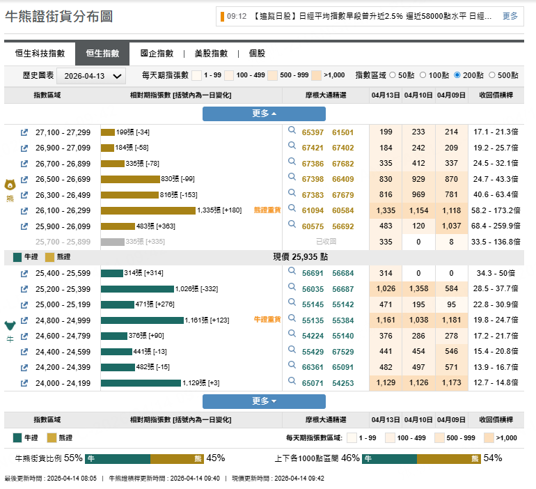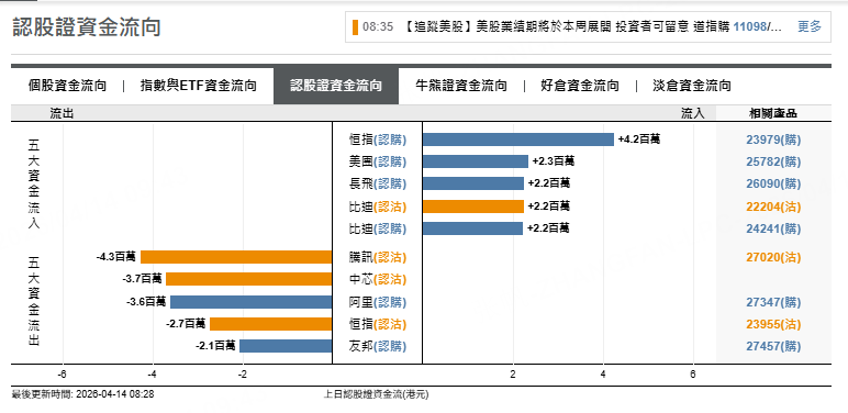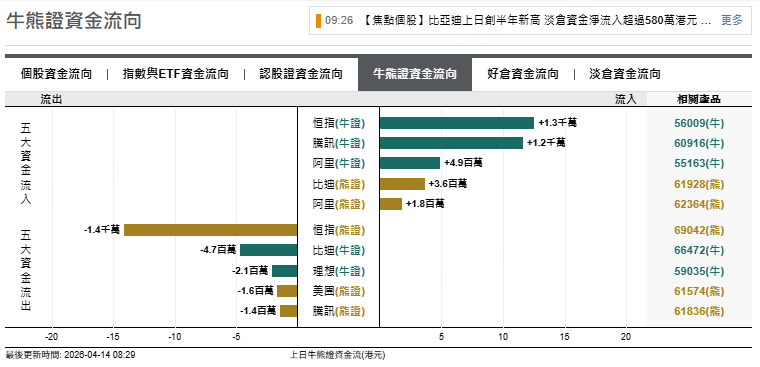 恒指熊證上日流出1400萬元,比迪牛證上日流出470萬元,理想牛證流出210萬元。