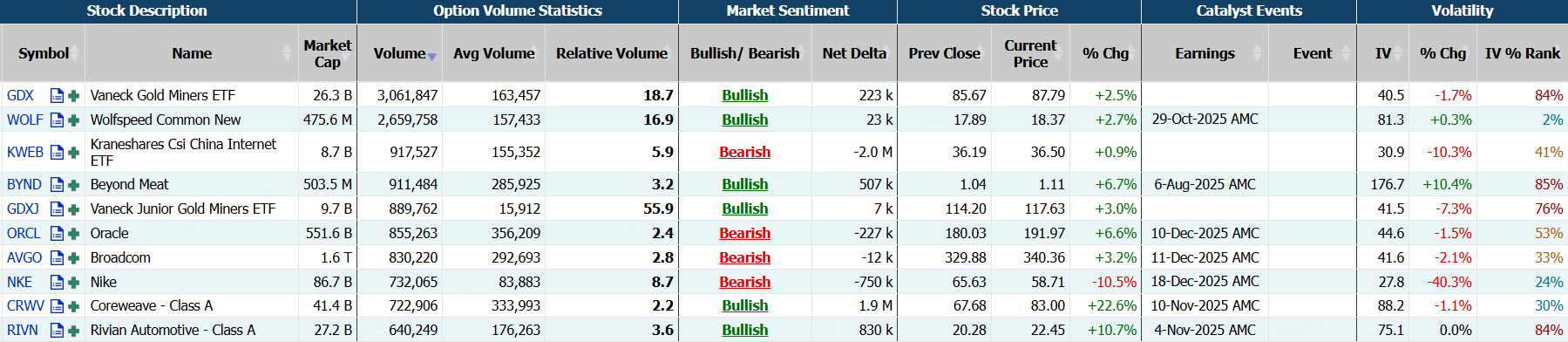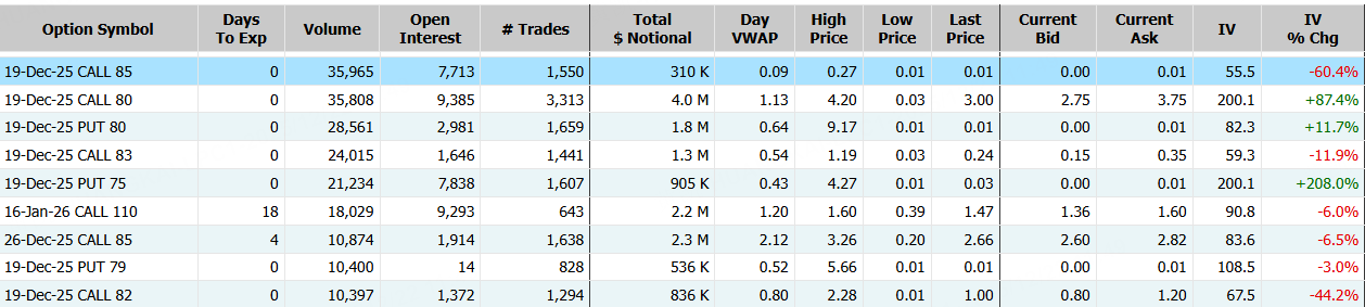 上周五,CoreWeave飙升22%,期权合约成交72.29万张,较90日均量放大2.2倍。12月19日到期的85美元的行权看涨期权交易量特别高,共有35,965份合约交易。