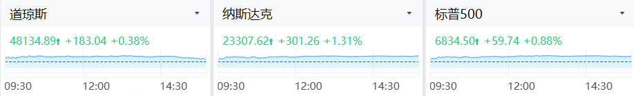 上周五(12月19日),美东三大指数集体收涨。截至收盘,道琼斯指数涨0.38%,报48,134.89点;标普500指数涨0.88%,报6,834.50点;纳斯达克指数涨1.31%,报23,307.62点。