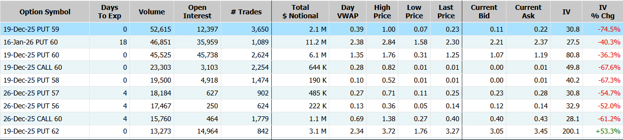 上周五,耐克跌超10%,期权合约成交73.33万张,较90日均量放大8.7倍。12月19日到期的59美元的行权看跌期权交易量特别高,共有52,615份合约交易。
