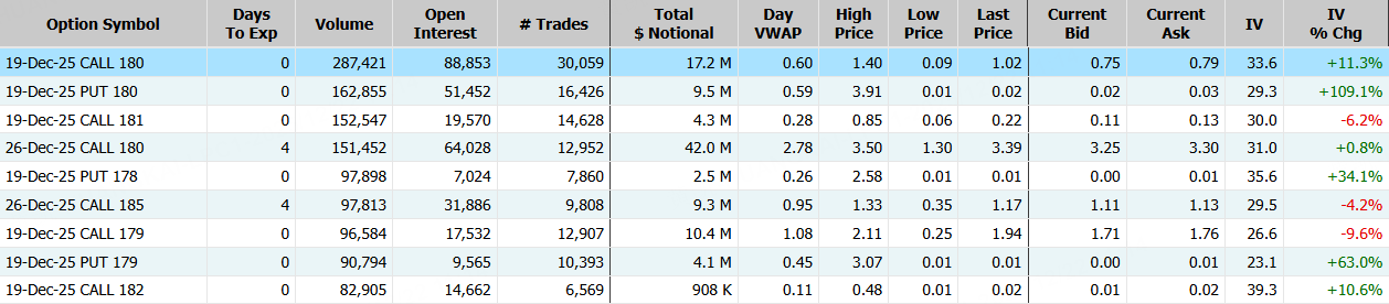 上周五,英伟达涨近4%,期权合约成交374.94万张,12月19日到期的180美元的行权看涨期权交易量特别高,共有287,421份合约交易。