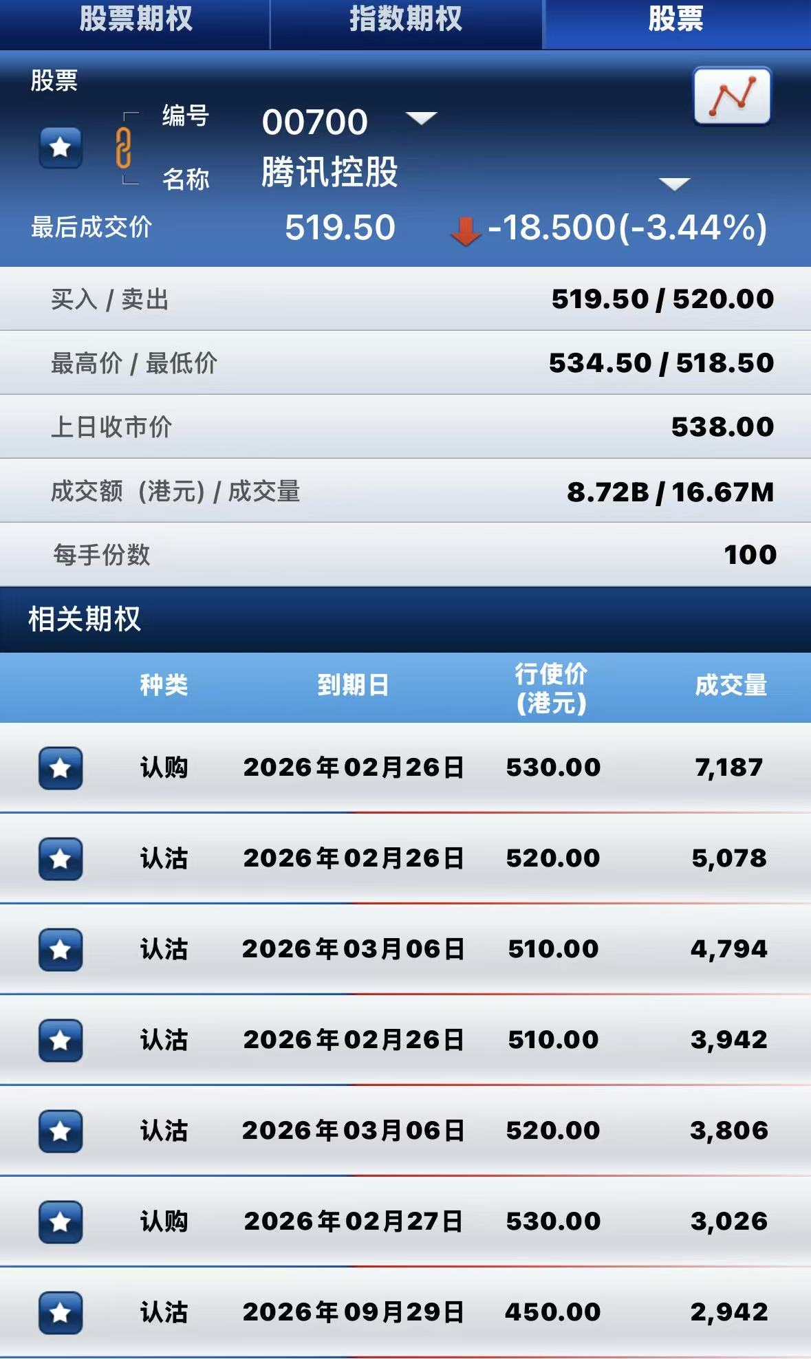 腾讯控股跌超3%,半日成交超9.2万张合约,其中于2月26日到期行权价530港元的认购期权成交量居前,成交近7200张合约。 $TCH.HK 20260226 530.00 CALL$