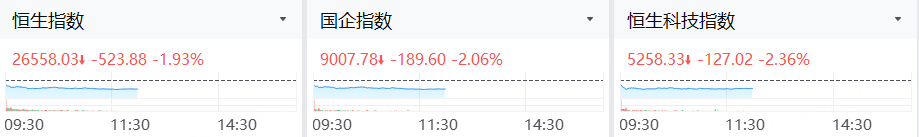 2月24日,港股三大指数齐跌,截止午间收盘,恒生指数跌1.93%,恒生科技指数跌2.36%,国企指数跌2.06%。