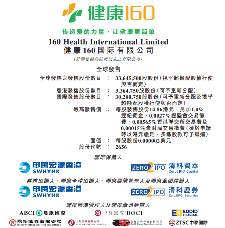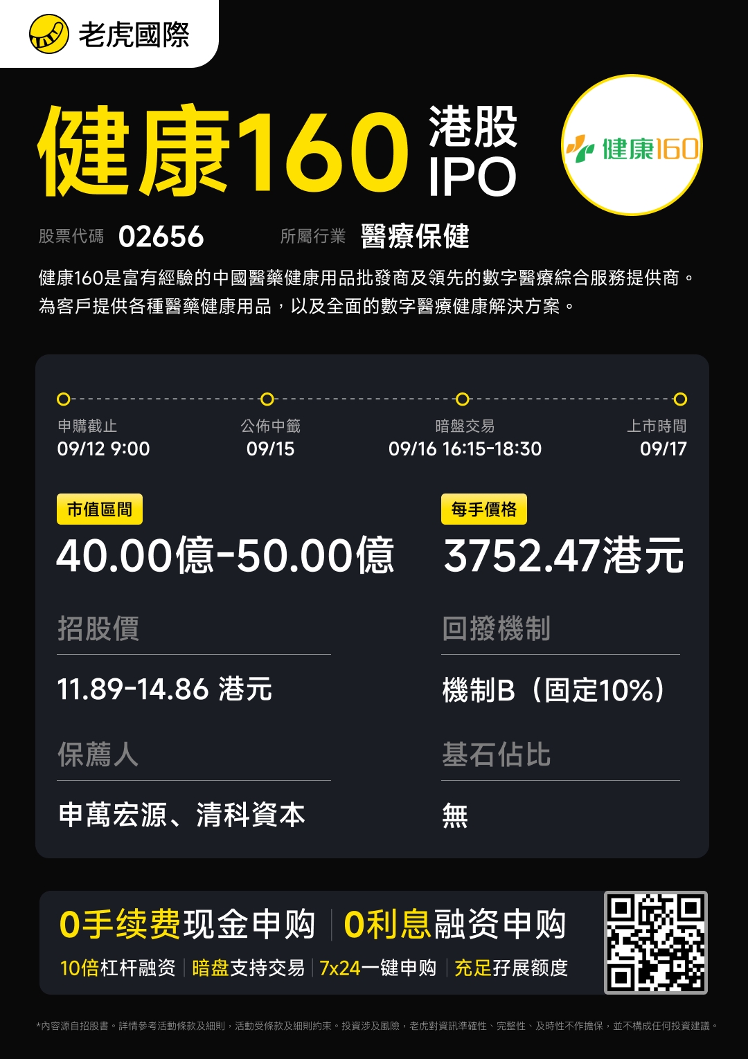 健康160于9月9日-9月12日招股,拟全球发售3364.55万股,香港公开发售占约10%,国际发售占约90%,另有约15%超额配股权。发售价将为每股发售股份11.89-14.86港元,每手250股,预期股份将于9月17日开始在联交所买卖。