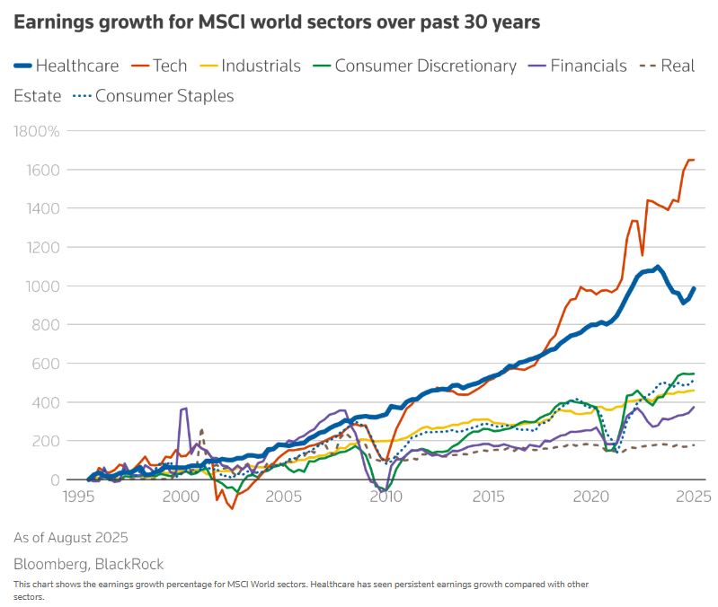 医疗保健板块近年来表现略显逊色,过去几年走势落后于大盘。但作为典型的防御性板块,医疗保健需求基本不受经济周期波动影响,历史数据也证明,即便在市场承压时期,该板块依然能实现强劲且稳定的盈利增长。