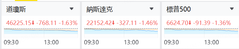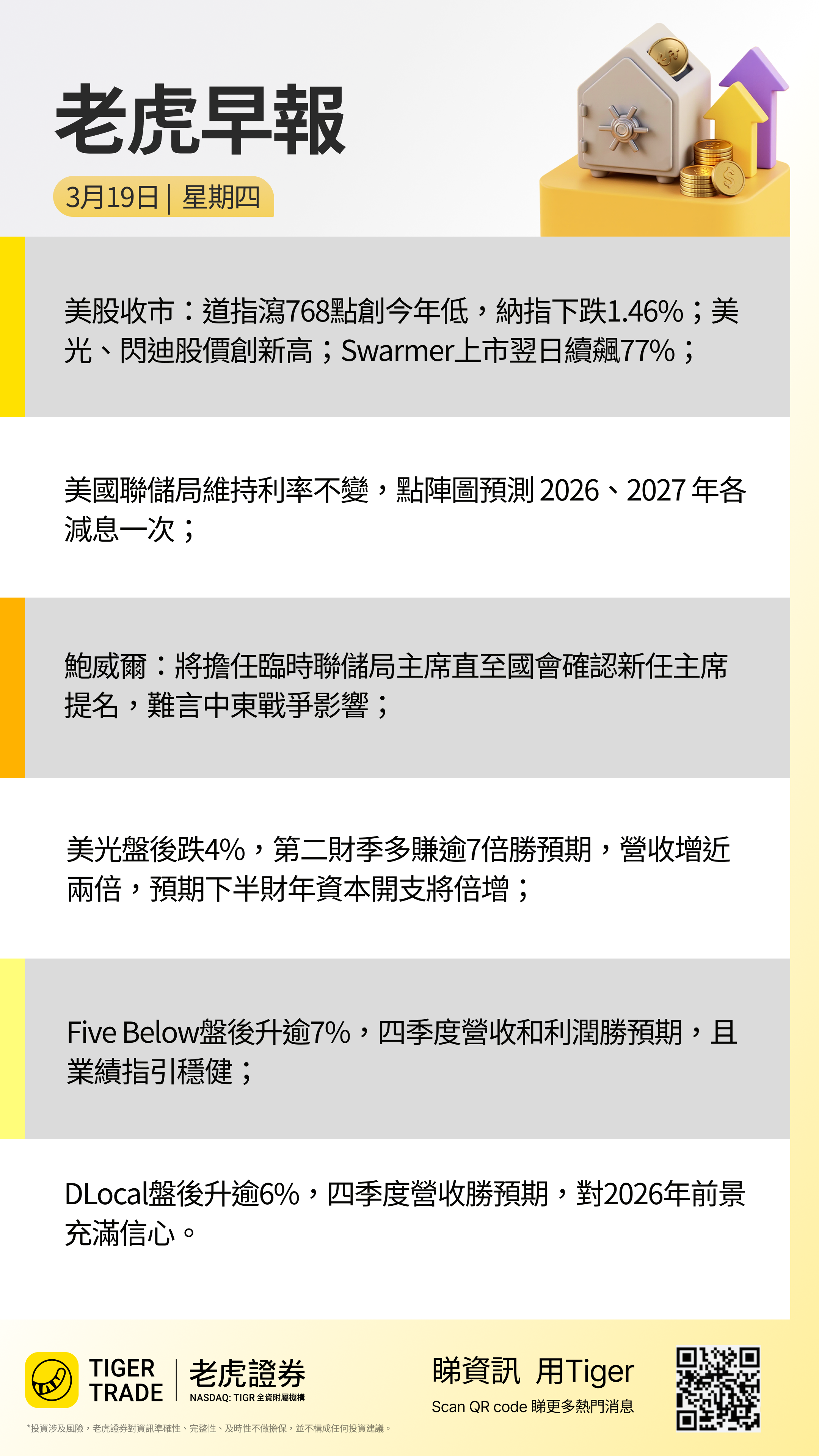 3月19日,美股三大指数集体收跌,截至收盘,道琼斯跌1.63%,报46225.15点;标普500跌1.36%,报6624.70点;纳斯达克跌1.46%,报22152.42点。交易集中于大型科技与AI链,部分个股因基本面与公司消息出现显著波动。