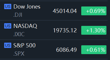 The Dow Jones Industrial Average rose 308.91 points, or 0.69%, to 45,014.44, the S&P 500 gained 36.59 points, or 0.60%, to 6,086.47 and the Nasdaq Composite gained 254.21 points, or 1.30%, to 19,735.12.