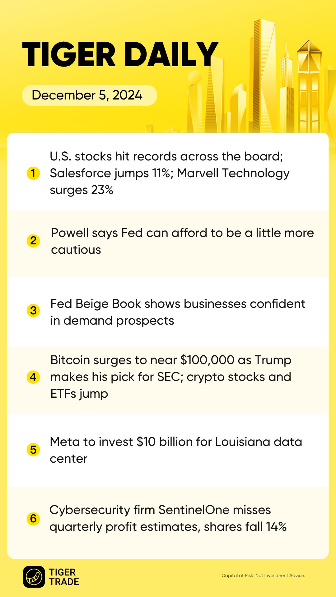 All three major U.S. stock indexes scored record closing highs on Wednesday as technology shares rallied after upbeat results from Salesforce and as comments by Federal Reserve Chair Jerome Powell gave a late boost to the market.