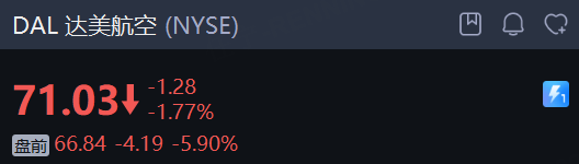 达美航空 大跌6%,公司预计2026年调整后每股收益为6.50至7.50美元,市场预估为7.20美元。同时,美国航空、阿拉斯加航空跌超2%,联合大陆航空跌1.93%,西南航空跌1.85%。