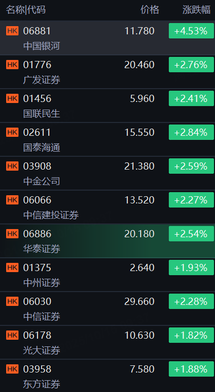 10月15日,港股中资券商股普涨,中国银河涨超4%,广发证券、国泰海通、中金公司、中信建投证券涨超2%。